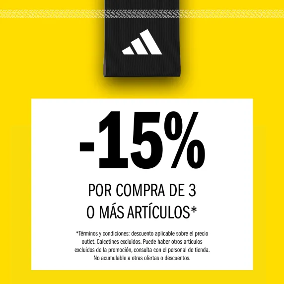 *Términos y condiciones: descuento aplicable sobre el precio outlet. Calcetines excluidos. Puede haber otros artículos excluidos de la promoción, consulta con el personal de tienda. No acumulable a otras ofertas o descuentos.